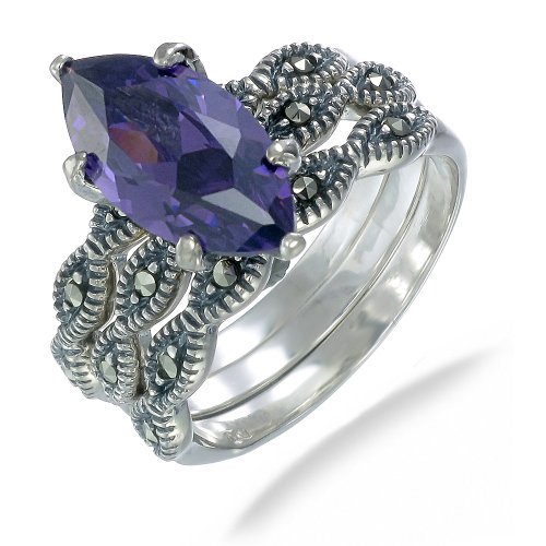 This is an excellent Purple CZ Engagement Ring In Sterling Silver. The stone is 15x7MM, Marquise Cut and 3.50 CT. There are Marcasite stones around the center Purple CZ.This ring will be a perfect gift for any occasion.